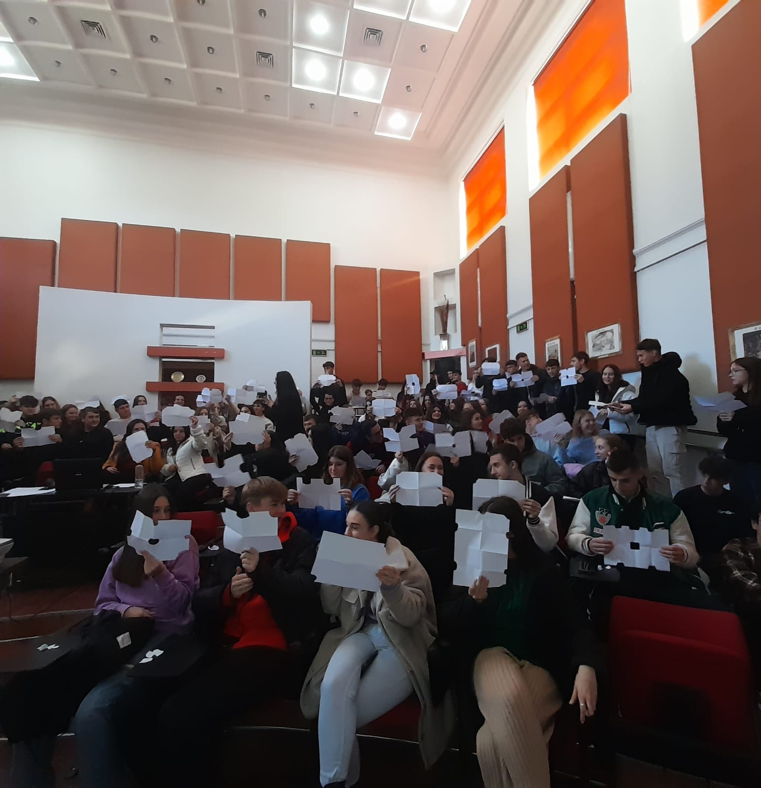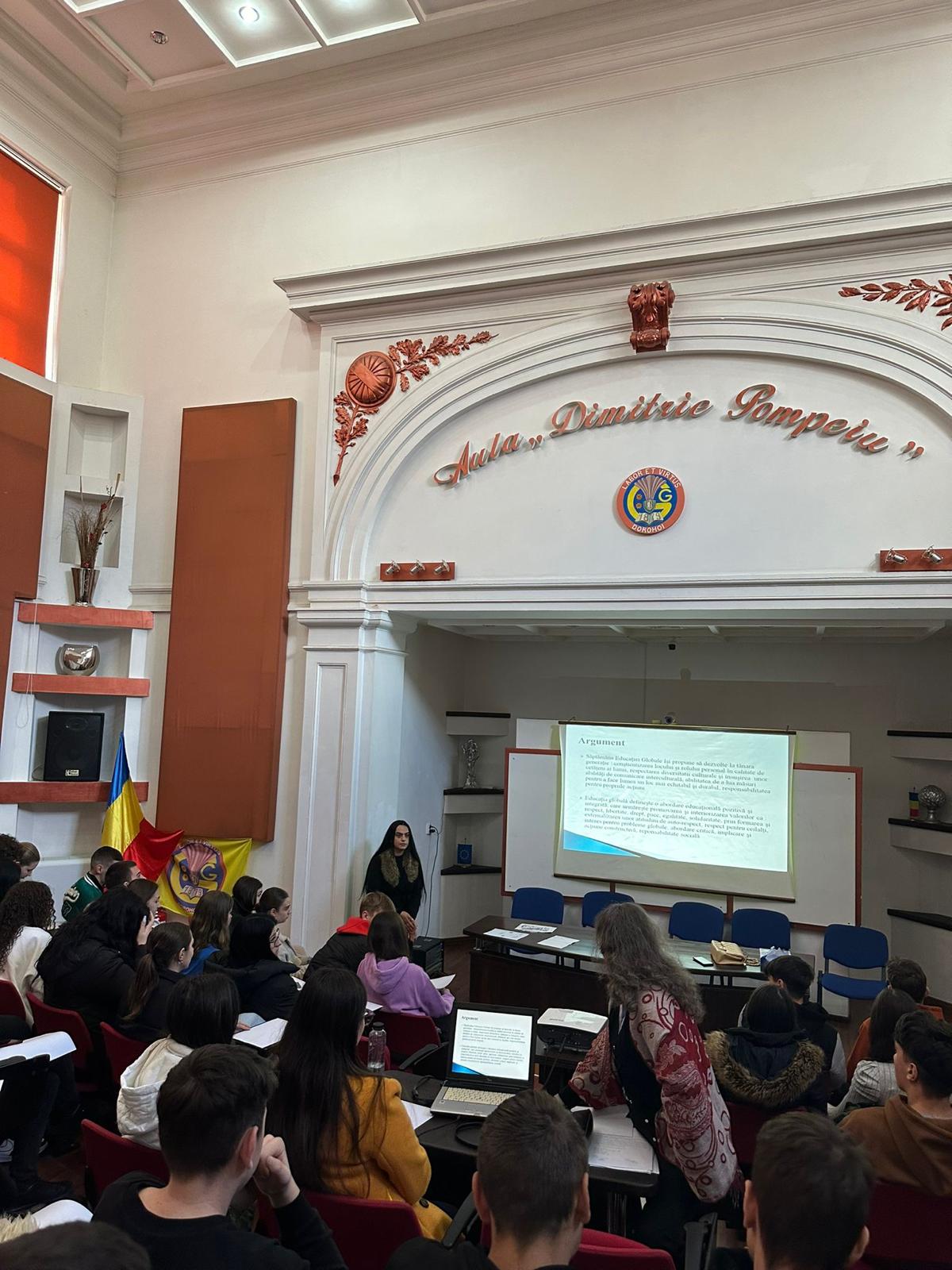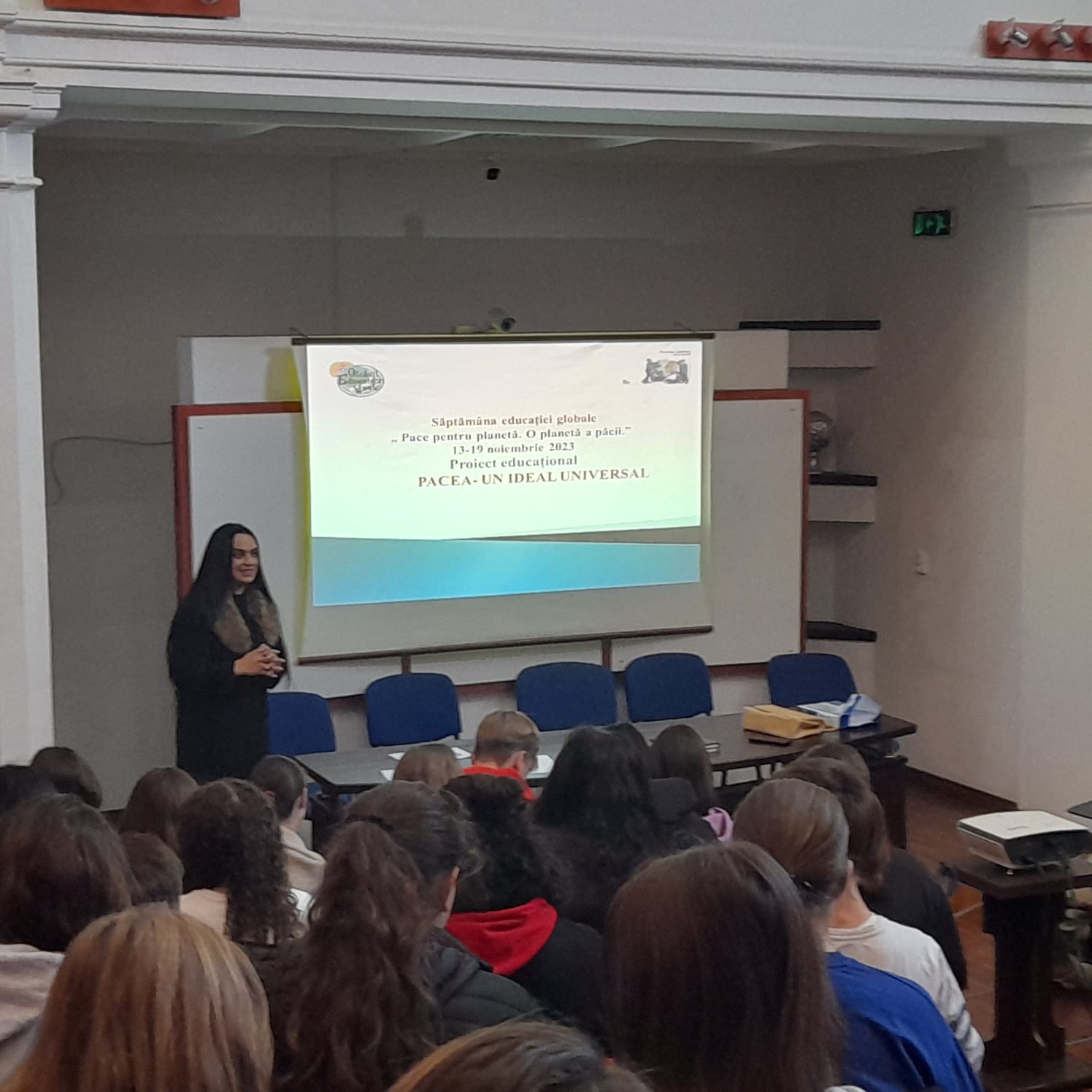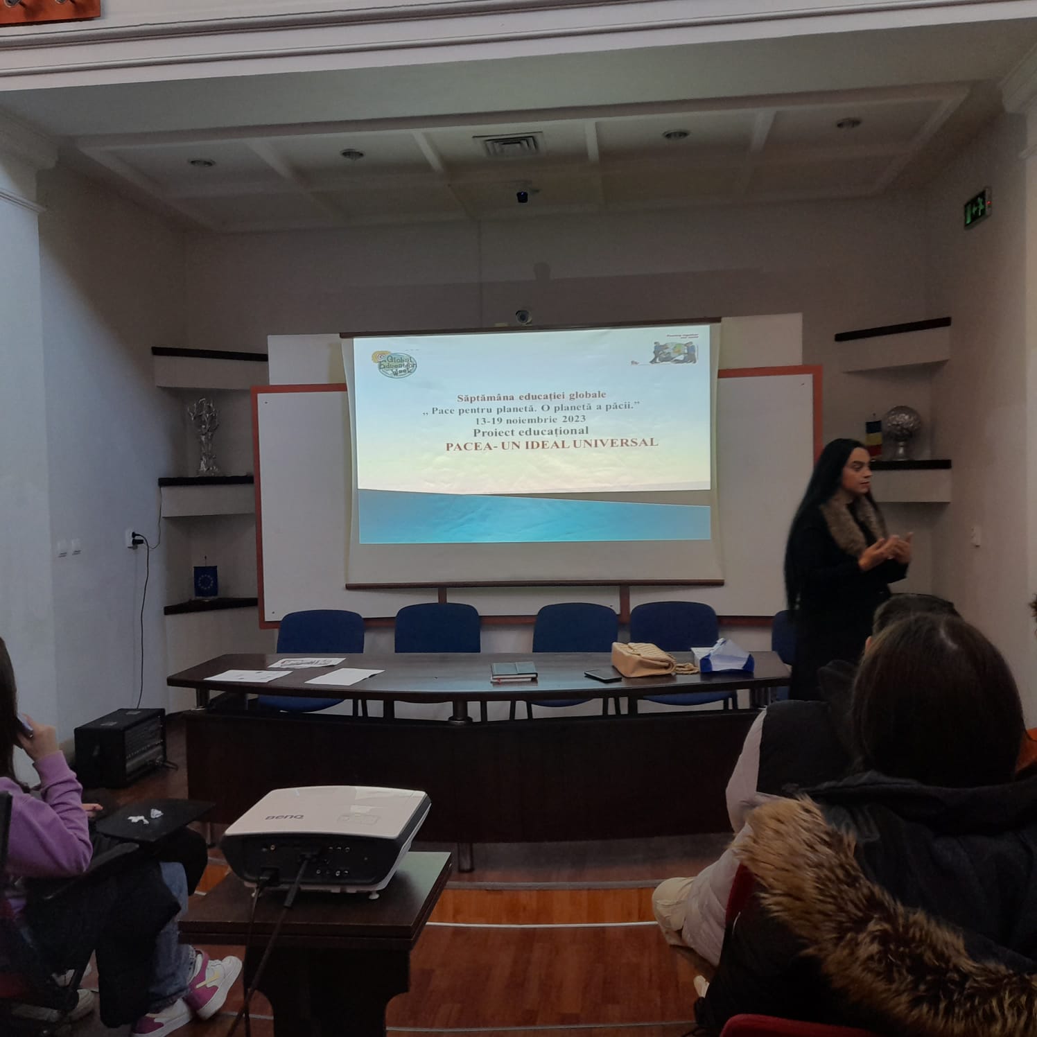 În cadrul Săptămânii Educației Globale desfășurată în perioada 13-19 noiembrie 2023, având ca temă: „Pace pentru planetă. O planetă a păcii”, a avut loc în Aula Colegiului, în ziua de marți 14 noiembrie 2023, o activitate din proiectul educațional PACEA – UN IDEAL UNIVERSAL, participând elevi din clasele IX- XII, alături de doamna mediator prof. Culicianu Irina și doamna prof. Malenchi Gafițanu Oana-Marina.