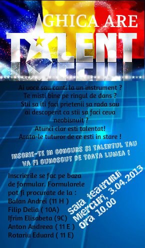In ziua de 13 Decembrie 2012, cursurile la Colegiul National Grigore Ghica vor fi suspendate din cauza conditiilor meteo nefavorabile. Pentru viitoarele informatii abonativa la pagina de facebook a scolii sau verificati site-ul!